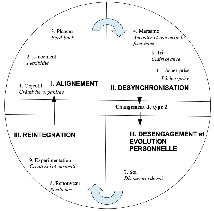 Dans ce processus, la personne vit donc une étape de développement personnel puis une étape d’expérimentation qui permettent de construire un cycle suivant différent du précédent. De la qualité de ce moment sur soi dépend la suite de l’évolution (recommencer la même chose ou aller vers quelque chose de nouveau). Tri, lâcher prise de la partie précédente doivent être approfondis pour ne pas venir parasiter cette période.
